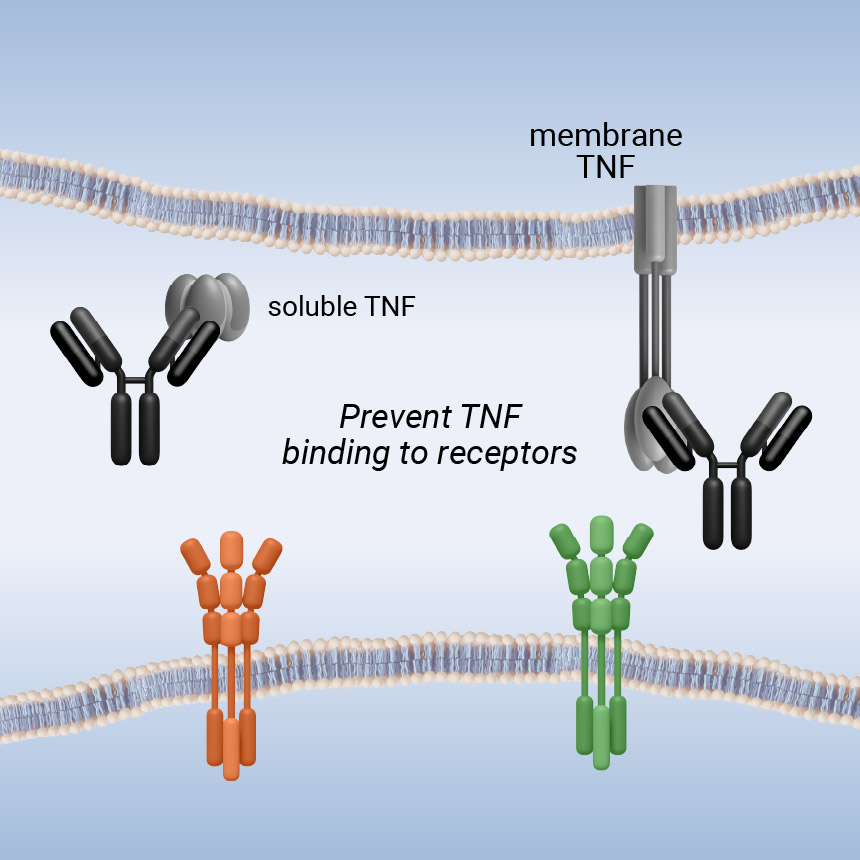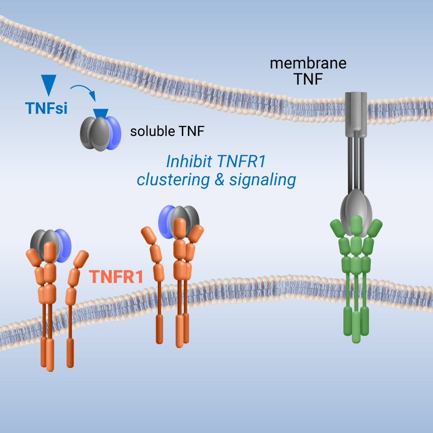 Unlike conventional biologics, the small molecule approach spares membrane TNF – TNF receptor signaling. Membrane TNF supports immune regulation, tissue repair and host defense. Our approach has the potential to provide targeted anti-inflammatory effects while minimizing unwanted immunosuppression – expanding potential uses and delivering a new treatment option for patients.